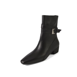 灰皮带扣方跟2025年新款绒面女百搭舒适方头粗跟短靴女