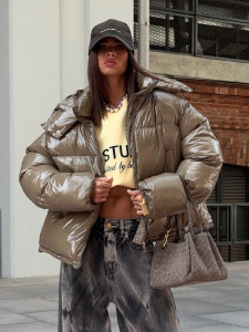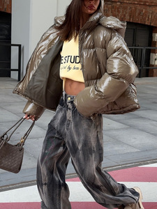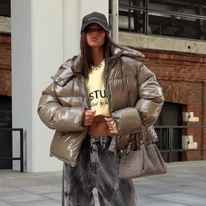 跨境亮面棉衣外套女短款连帽面包服宽松保暖棉服秋冬街头潮人穿搭