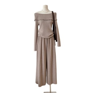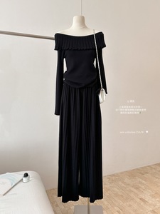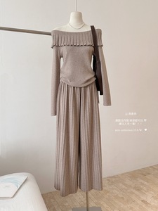 秋上新!一字肩韩系长袖收腰针织衫女温柔风套装休闲阔腿裤两件套