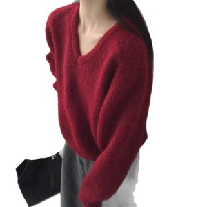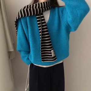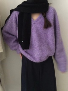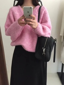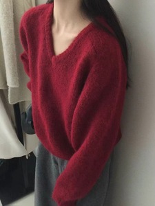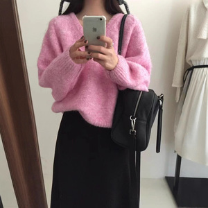 韩系慵懒感纯色V领毛衣秋季新款宽松时尚针织衫长袖简约针织上衣