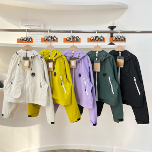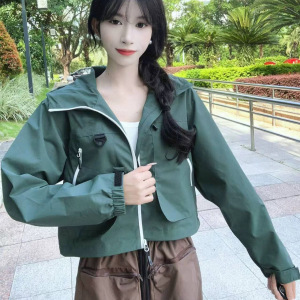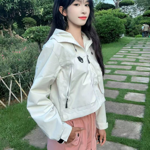 0924x4~户外休闲宽松字母刺绣防风保暖女士立领连帽短款冲锋衣外