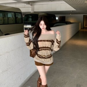 实拍法式一字肩条纹针织毛衣女秋季新款韩系慵懒氛围感温柔风上衣