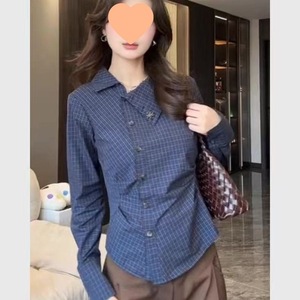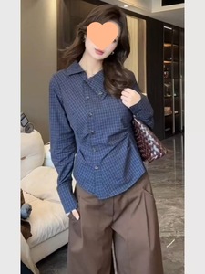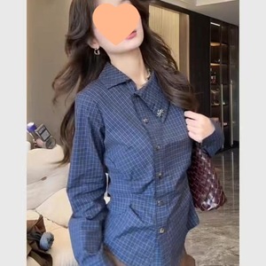 蓝色格纹长袖衬衫秋季法式特别漂亮掐腰上衣设计感小众女