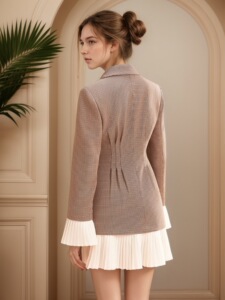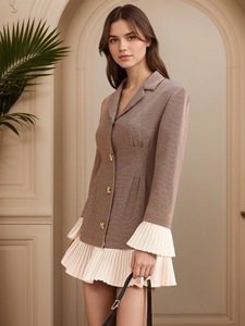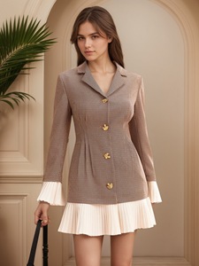 2025秋冬季跨境欧美收腰格纹拼色褶皱收腰设计气质百褶西装连衣裙