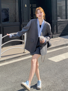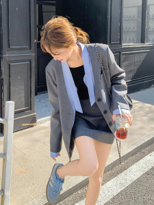 假两件灰色西装套装女早秋2025新款韩系减龄穿搭半身裙两件套超火