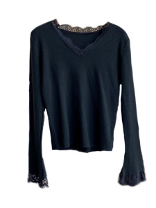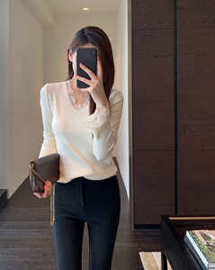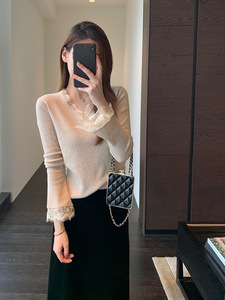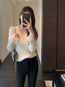 法式蕾丝 优雅时髦V领针织衫显瘦拼接打底衫女毛衣秋冬新G092408