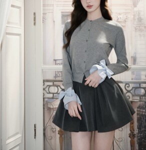 avenemen/假两件针织开衫/蝴蝶结拼接圆领毛衣上衣外套女早秋