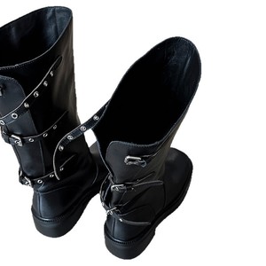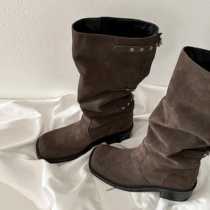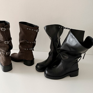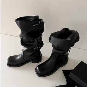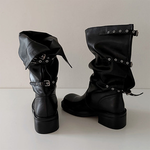 牛皮版~韩系真皮翻折两穿堆堆靴女皮带扣中筒马丁靴褶皱骑士靴