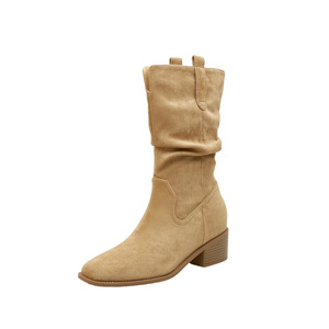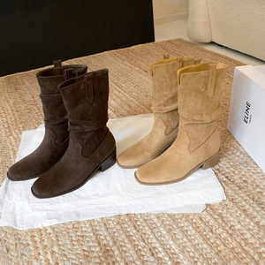 2025秋冬季新款韩版圆头V口粗跟厚底显瘦大筒围堆堆靴真皮女短靴