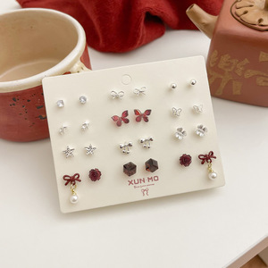 秋冬新款酒红色系樱桃耳钉套装女小巧复古安卡拉红耳环百搭耳饰品