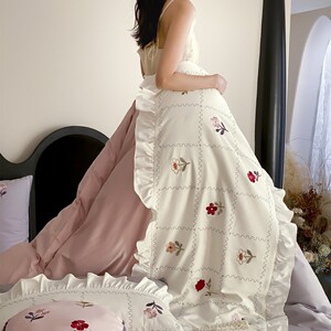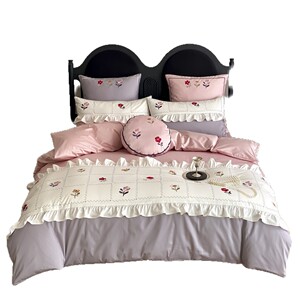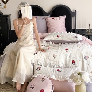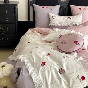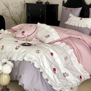 少女风韩式花边刺绣全棉亲肤裸睡级床品纯棉长绒棉四件套微风与花