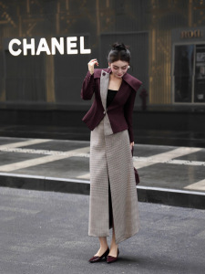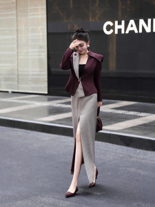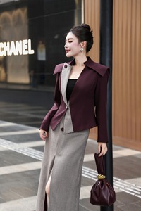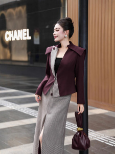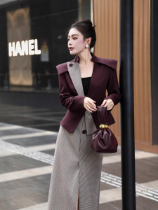 秋季新款高级感撞色西装套装女设计感小众开叉半身裙时尚两件套