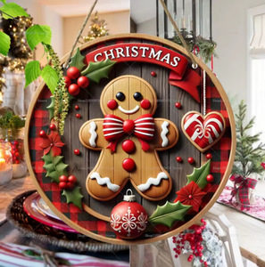 2D圣诞快乐红黑格子浆果姜饼人木制挂牌壁挂标志前门廊家居装饰