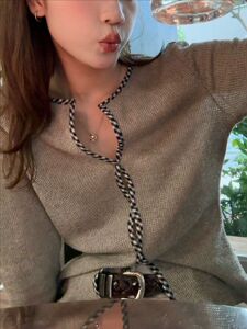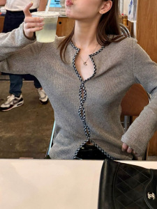 LelyMooh/解构主义门襟格纹扭结包边收腰显瘦针织打底衫长袖上衣
