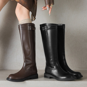 全牛皮洋气小皮带扣骑士靴2025秋冬粗低跟圆头咖色真皮高筒长靴女