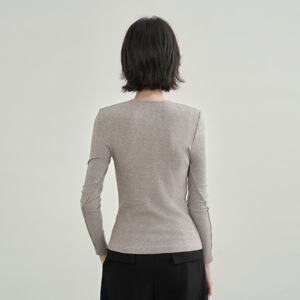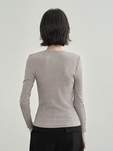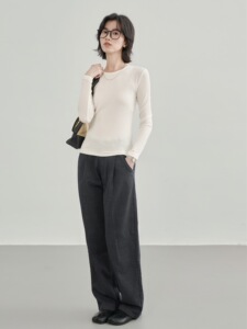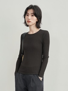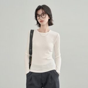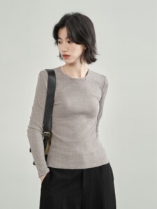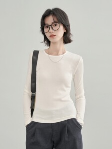 弹力针织长袖T恤女圆领外穿通勤修身显瘦坑条螺纹正肩打底衫上衣