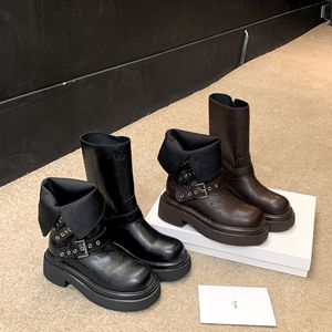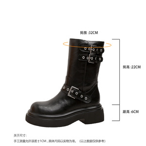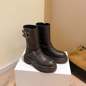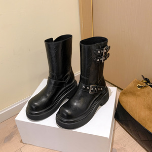 马丁靴女秋冬新款圆头骑士靴金属皮带扣厚底短靴真皮百搭机车靴子