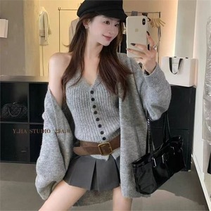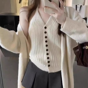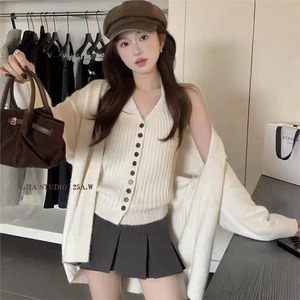 2025秋季新款韩版宽松显瘦百搭v领坑条挂脖背心+针织开衫两件套女