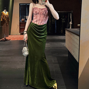 【叙兰时】植物扎染吊带丝绒连衣裙2025秋冬新款港风复古拼接长裙