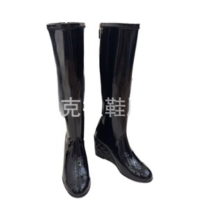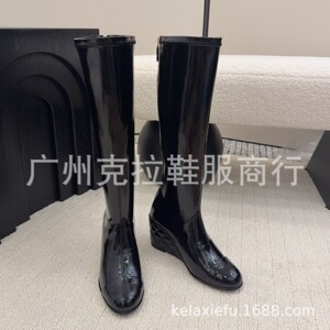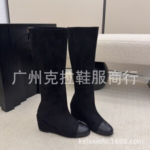 高定2025秋冬小香真皮圆头坡跟后拉链高筒弹力瘦瘦靴高跟不过膝靴