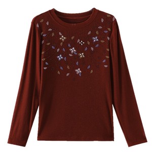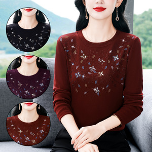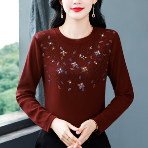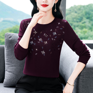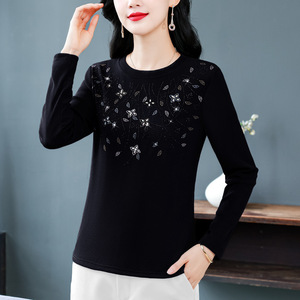 秋装新款圆领内搭小衫女长袖T恤气质修身显瘦烫钻妈妈针织打底衫