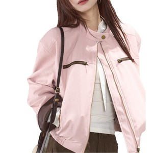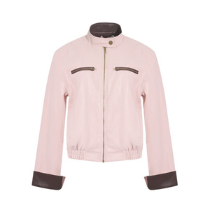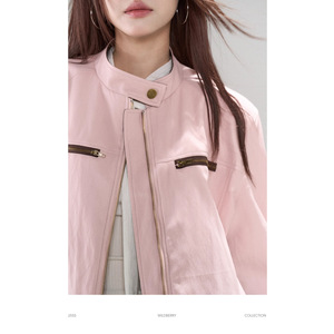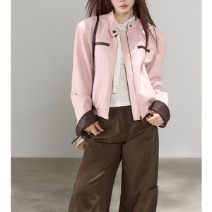 韩系甜美温柔风拼接撞色粉色皮衣外套女秋季新款休闲百搭立领夹克
