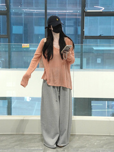 韩系橘色v领坑条长袖针织衫女氛围感穿搭早秋小香风宽松软糯上衣