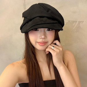 韩系复古褶皱黑色贝雷帽女夏季显脸小报童帽大头围八角画家帽子