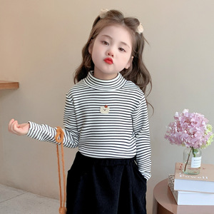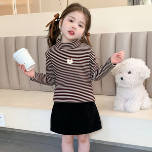女童加绒打底衫一体绒秋冬装25新款女宝宝儿童条纹半高领内搭上衣