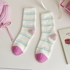 粉色加绒袜子女加厚保暖卡通兔子可爱日系条纹毛绒堆堆睡眠地板袜