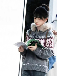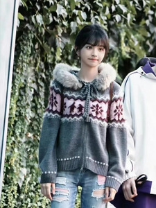 高级感提花费尔岛毛衣外套女秋冬季慵懒风设计感连帽针织开衫上衣