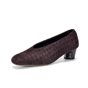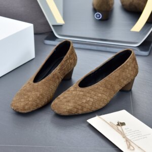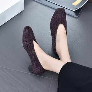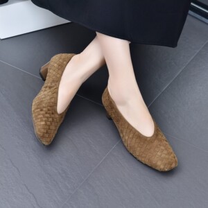 2025秋季新款真皮头层羊皮绒面羊猄编织方头中跟单鞋时尚粗跟女鞋