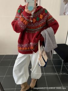 软糯费尔岛提花连帽毛衣外套女秋冬新款韩版宽松厚拉链针织开衫