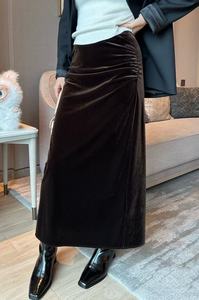 法式优雅丝绒褶皱半身裙女秋季新款松紧高腰修身显瘦后开叉长裙子