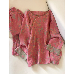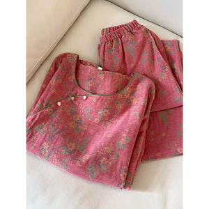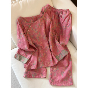 新中式春秋国风植物花卉印花睡衣女宽松复古宫廷奢华家居服两件套