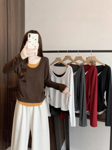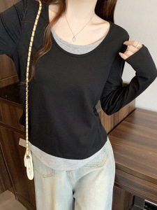 2025年秋装新款胖mm大码女撞色设计感假两件正肩气质显瘦长袖上衣