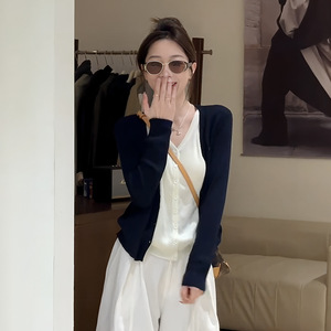 韩系撞色假两件V领针织开衫女秋季独特超好看别致修身打底衫上衣