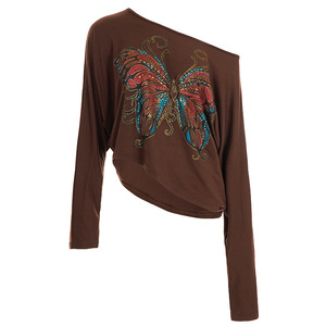 森系精灵风彩色蝴蝶印花不规则T恤个性时尚辣妹复古宽松休闲上衣