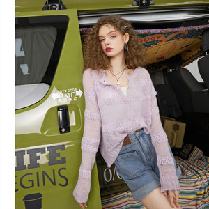 妖精的口袋紫色镂空针织开衫女2025春秋新款薄款外搭宽松纯欲上衣