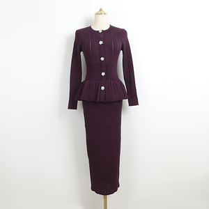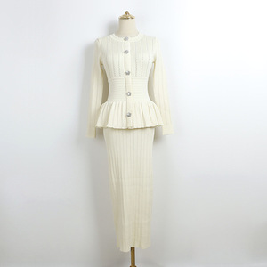 秋冬时尚针织长袖长裙钻纽扣荷叶边收腰连衣裙复古超显身材裙子