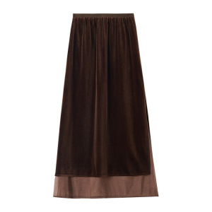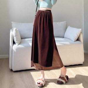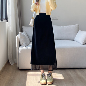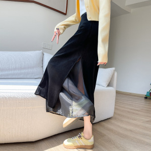 网纱拼接丝绒半身裙子女2025秋季新款时尚百搭显瘦开叉直筒中长裙