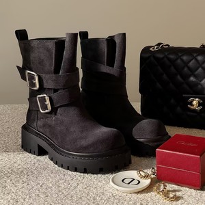 爆款版~英伦风粗跟小短靴女秋冬新款皮带扣显瘦侧拉链厚底骑士靴