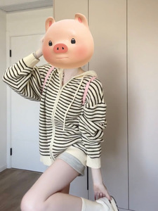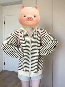 miu系软糯撞色条纹连帽针织开衫女秋季松弛感宽松慵懒风毛衣外套