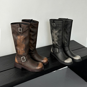 牛皮擦色骑士靴女高筒长靴秋冬新款真皮圆头粗中跟皮带扣及膝靴女