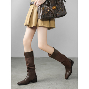 巨显腿瘦~方头褶皱骑士靴女2025秋冬复古粗中跟长筒靴
