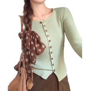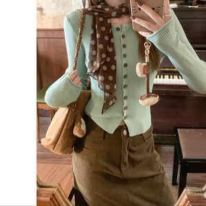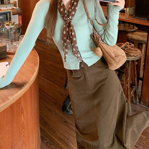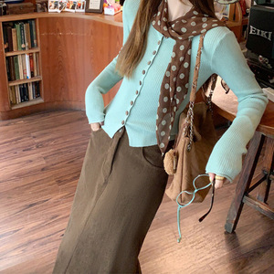 早秋韩系绿色短款气质长袖针织衫修身开衫上衣秋季开衩咖色半身裙