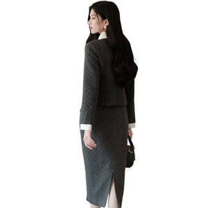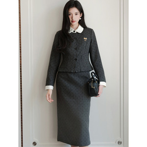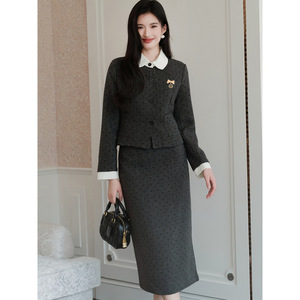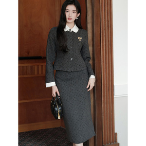 小香风套装气质超好看学院风复古灰色外套半身裙两件套2025年秋季