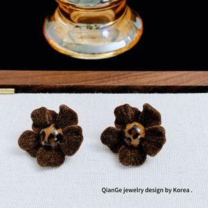 秋冬复古咖色植绒花朵豹纹珠珠耳钉女 s925银针时尚气质个性耳环