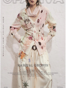 OfAkiva“荷鲁斯”水彩猫咪印花衬衫女领巾系带收腰衬衣