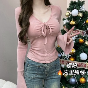 磨毛纯色V领抽绳系带高级感长袖T恤女装秋冬打底衫修身喇叭袖上衣